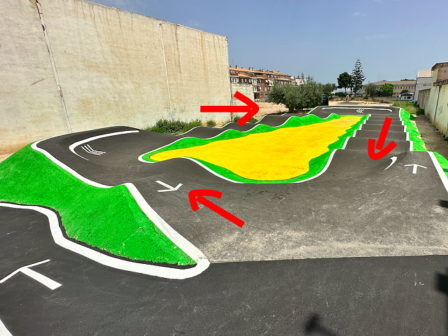 Es un circuito de un tamaño pequeño. De unos 60 metros por vuelta. Los peraltes estan bien diseñados y permite entrar y salir con velocidad sin problema. La dificultad la encontramos en una recta con demasiados dubbies. Estan muy marcados y juntos lo que mantener la velocidad se hace bastante dificil y fisico. Velocidad que necesitas si quieres enlazar alguno de los modulos que encontramos en el retorno despues del peralte del fondo. Creemos que es un ciruito que se rodaria mejor en el sentido contrario del que esta marcado. Lo hemos rodado en ambos sentidos y parece ser que es la mejor opcion. La zona de salida es muy pequeña. El acceso a la zona de salida y entrada al circuito estan bastante bien y son de facil acceso. La parte de arriba de los peraltes tiene un buen tamaño por si los peques deciden subir por encima de ellos. El circuito esta justo al lado de la acera y no esta delimitado por nada por lo que tenemos que tener cuidado de no chocar con nadie al entrar y salir de la zona del circuito. Esta un poco encajonado entre dos edificios y en la parte de atras esta toda limpia como si estubiese programado seguir ampliando la zona con algun parque o instalacion. Os dejo un video modulo modulo para que podais haceros una mejor idea del circuito.