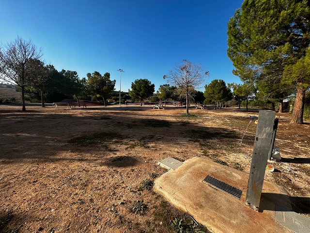 El recinto cuenta con una zona de mesas entre árboles para poder comer y agua potable de una fuente. También tiene luz, cosa que va muy bien en invierno con los días tan cortos. Está junto a un parque muy bonito con columpios para los peques y una zona para mascotas.