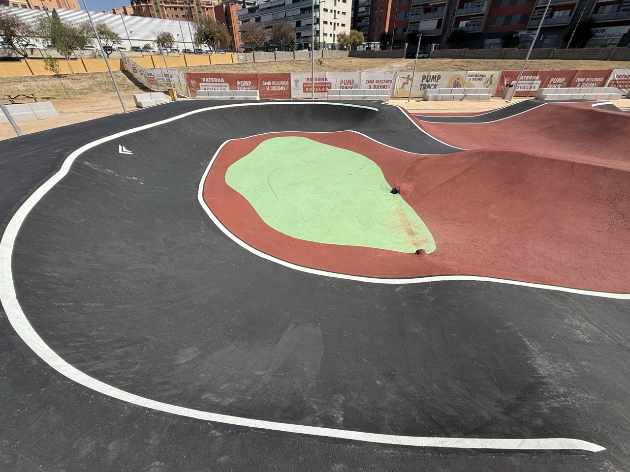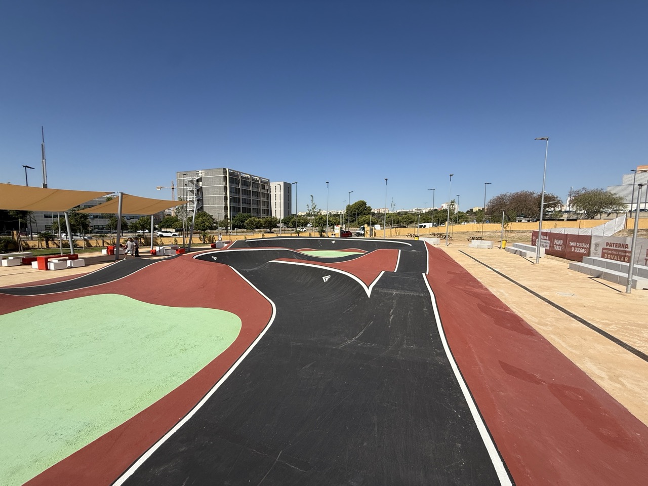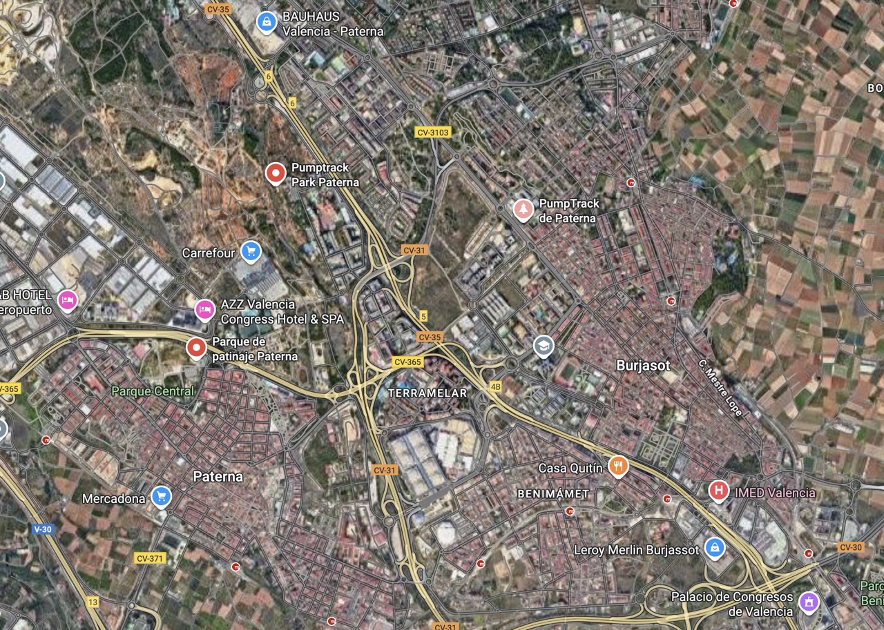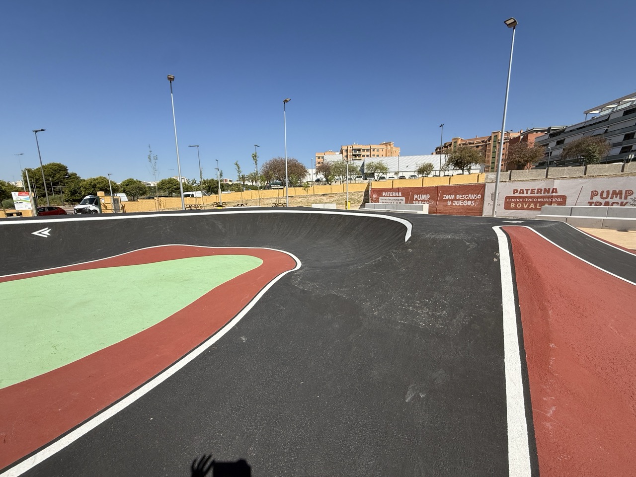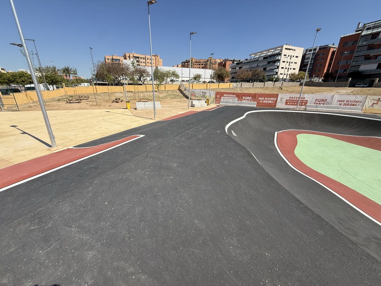 Paterna nos ofrece todos los serivcios necesarios. En la zona podemos encontrar supermercados, cafeterias, restaurantes, etc. Justo al lado tenemos un mercadona, donde podremos ir al baño y comprar alguna cosa que podamos necesitar. Incluso el parking es de acceso libre. Igualmete no suele ser complicado aparcar alrededor del circuito. El recinto del parque, cuenta con unas mesas y una zona con unas lonas para proteger del sol. Tambien tiene un punto de agua.