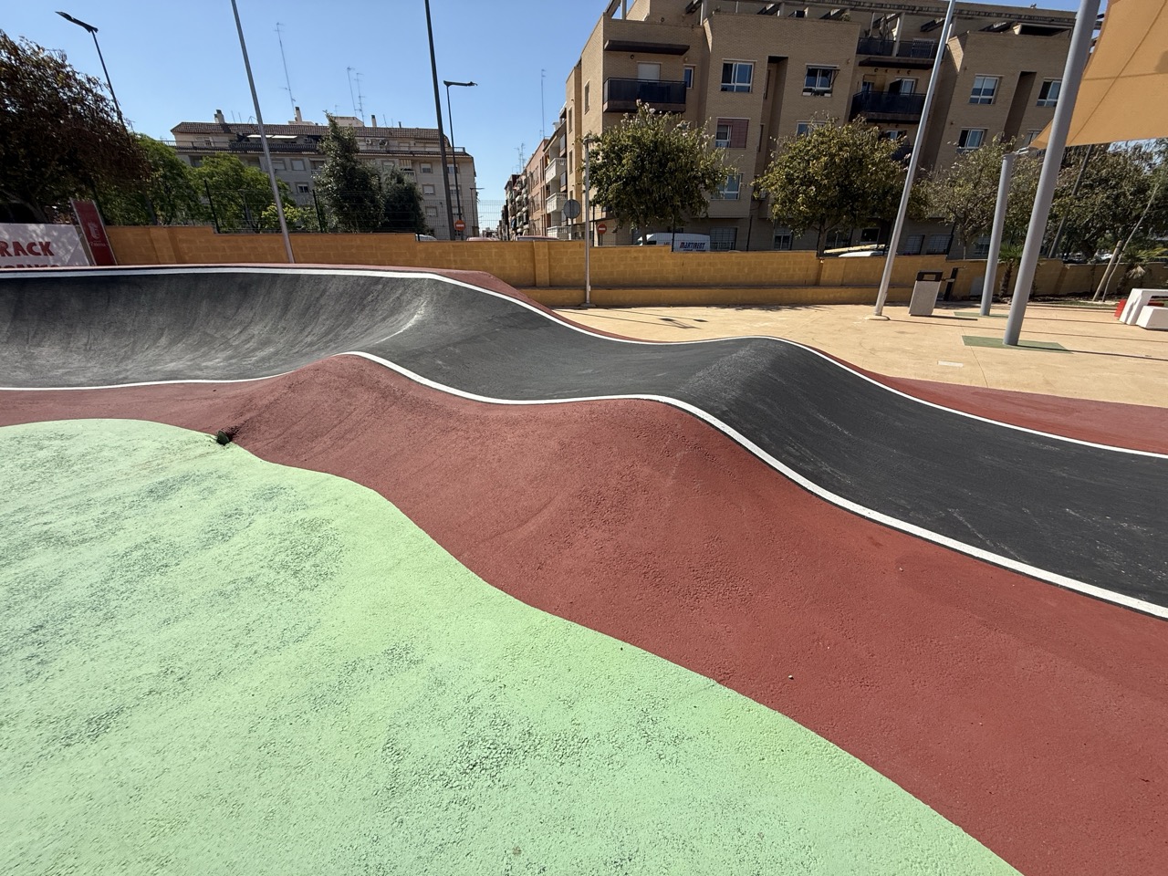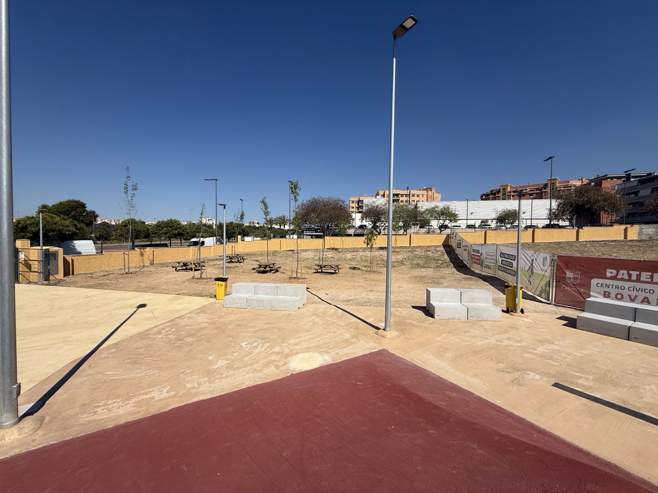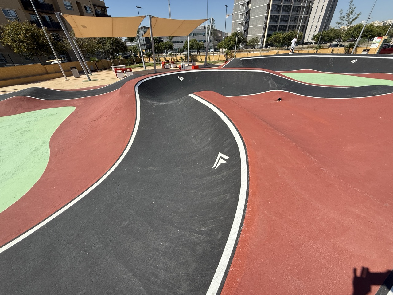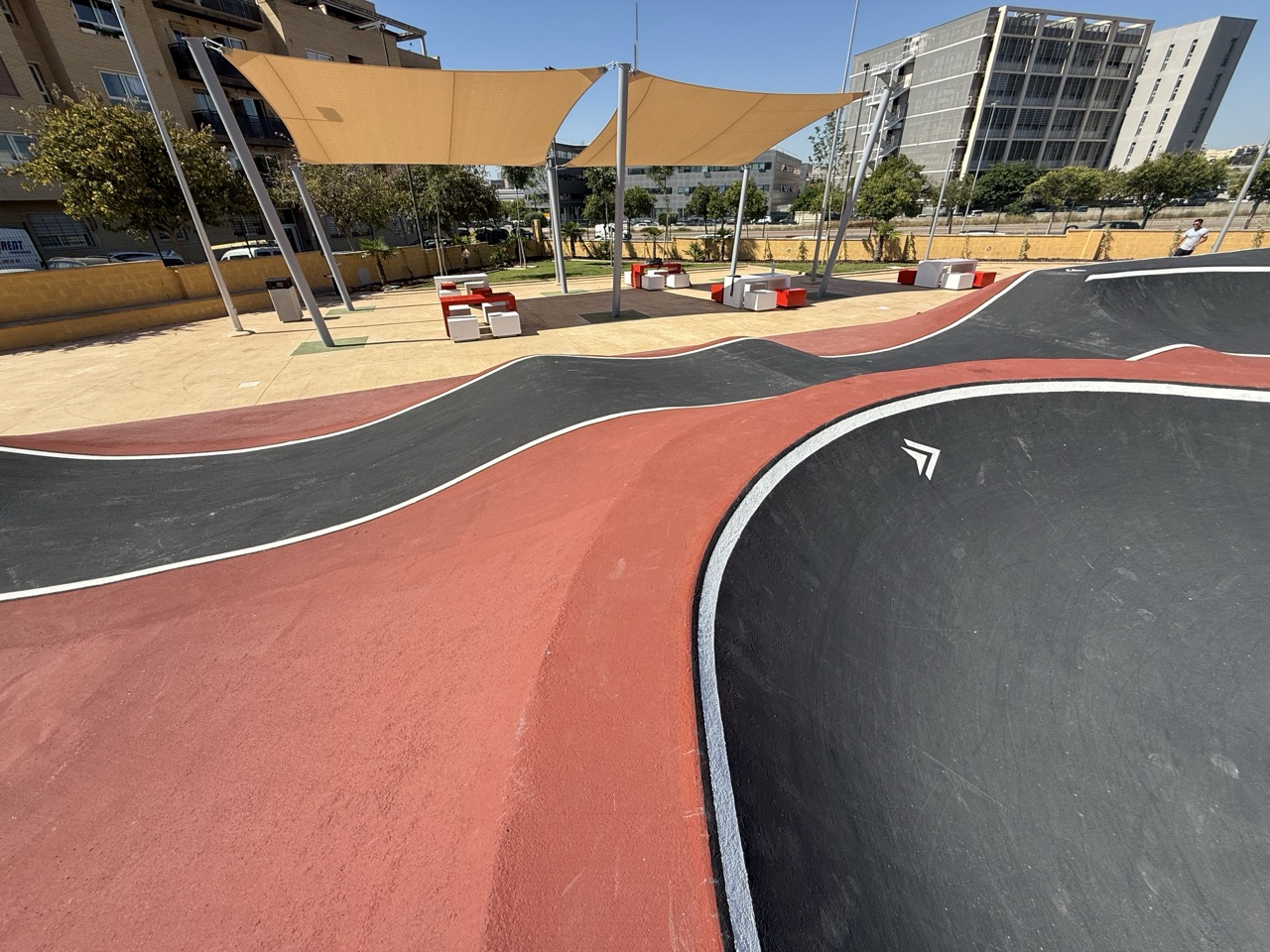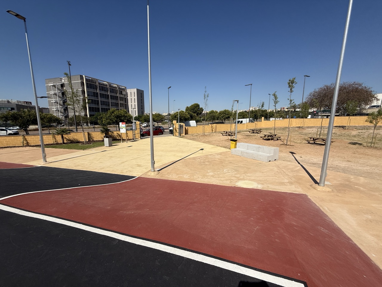 Paterna nos ofrece todos los serivcios necesarios. En la zona podemos encontrar supermercados, cafeterias, restaurantes, etc. Justo al lado tenemos un mercadona, donde podremos ir al baño y comprar alguna cosa que podamos necesitar. Incluso el parking es de acceso libre. Igualmete no suele ser complicado aparcar alrededor del circuito. El recinto del parque, cuenta con unas mesas y una zona con unas lonas para proteger del sol. Tambien tiene un punto de agua.