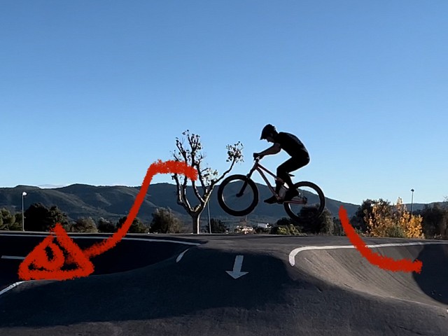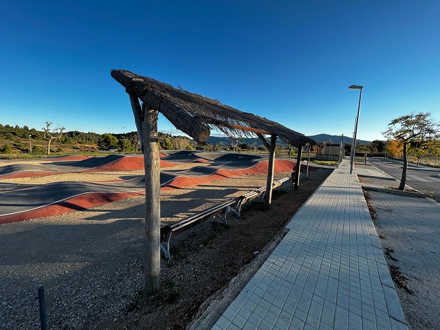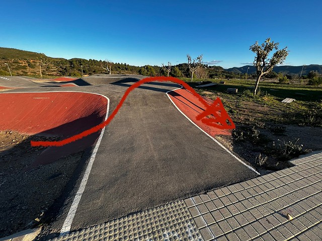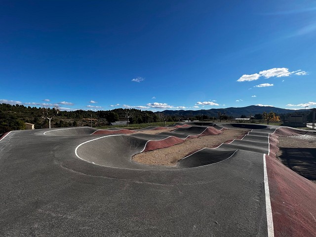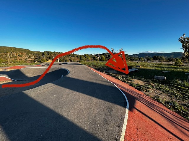 El circuito, se encuentra en una zona abierta, no está vallado, por lo que podemos acceder sin problema a cualquier hora del día. Es un circuito bastante amplio, unos 200 metros por vuelta completa. Rodeado de unas vistas muy bonitas de la zona. Se rueda muy bien y está todo muy bien terminado. Los peraltes no son de los más pronunciados pero tienen un buen recorrido. En la zona central, que comparten las dos vueltas, tenemos una meseta de dos alturas muy divertidas que dan bastante juego y es bastante segura para poder mejorar nuestra técnica. Al ser bastante amplio el circuito en esa zona, se pueden utilizar como si fuese un módulo de un skatepark y pasar el rato sacando cosas en él. El resto de módulos si se quieren enlazar tienen un tamaño que exigen llevar buen ritmo y algo de técnica pero no son muy marcados por lo que invita a intentar mejorar poco a poco. Esto mismo hace que sea un circuito muy válido para otros usuarios con skates, patines o patinetes. En general un circuito muy bueno para pasar el día, con un entorno en la naturaleza. El circuito está diseñado para rodarlo en un sentido pero permite poder hacer alguna vuelta en sentido contrario sin perder fluidez.