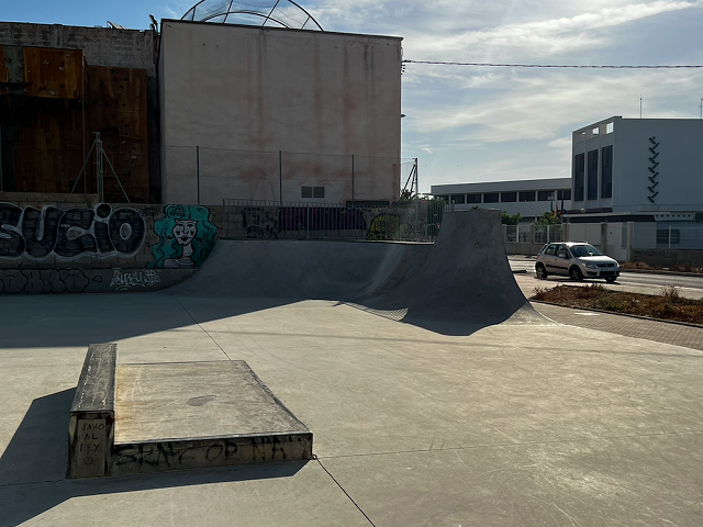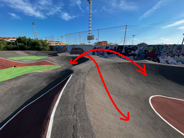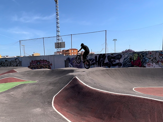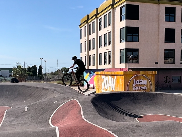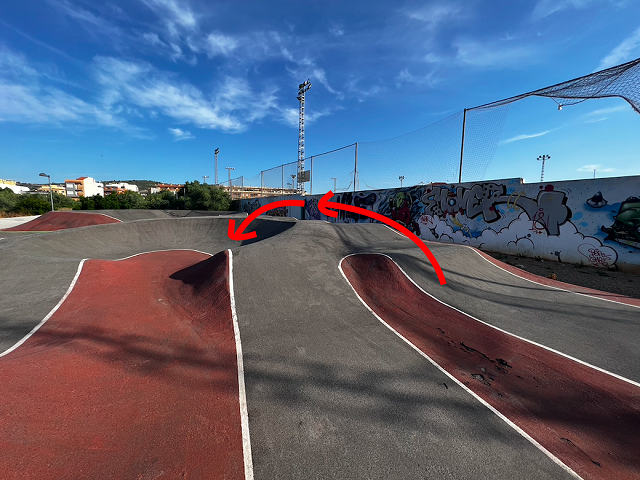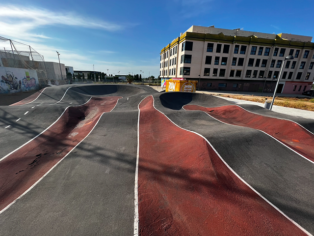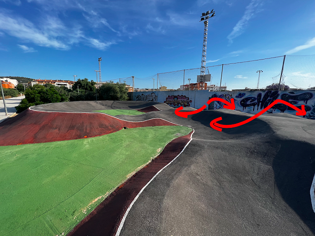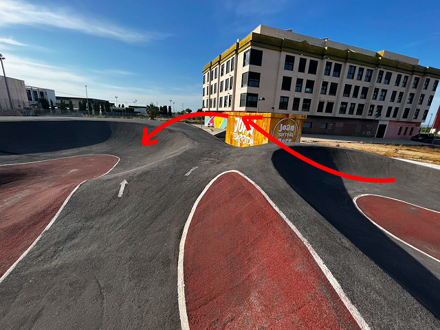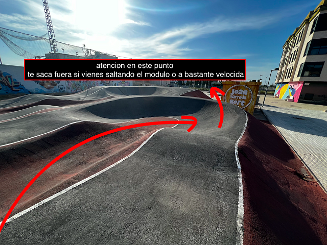 Es un circuito que se encuentra justo al lado de un skatepark, no esta en ninguna zona vallada por lo que podemos acceder sin problema a cualquier hora.Tiene algo de iluminacion. No tiene ninguna zona con bancos o donde dejar las cosas pero es muy amplio y con muchas zonas donde poder hacerlo. La idea es buena pero tubimos dificultades con un peralte cerca de la zona de salida que tiene justo delante un modulo para poder saltar tipo meseta. Si entras con la velocidad adecuada para saltar era casi imposible dar ese peralte sin frenar o sin salirse. Me imagino que si tienes mucha tecnica puedas salvar los muebles pero ese punto en concreto nos costaba poder hacerlo con velocidad sin salirnos. Ese mismo modulo si intentas pasarlo a manual nos pegaba un poco latigazo en la bici por el tipo de salida tan marcado. La primera meseta que encontramos tipo step up, es bastante grande y tecnica y para poder pasarla con facilidad debes venir con mucha velocidad. Este punto en skate que es mas dificil todavia para principiantes. Esta diseñado para hacerlo en un sentido y la vuelta tiene unos 150 metros.