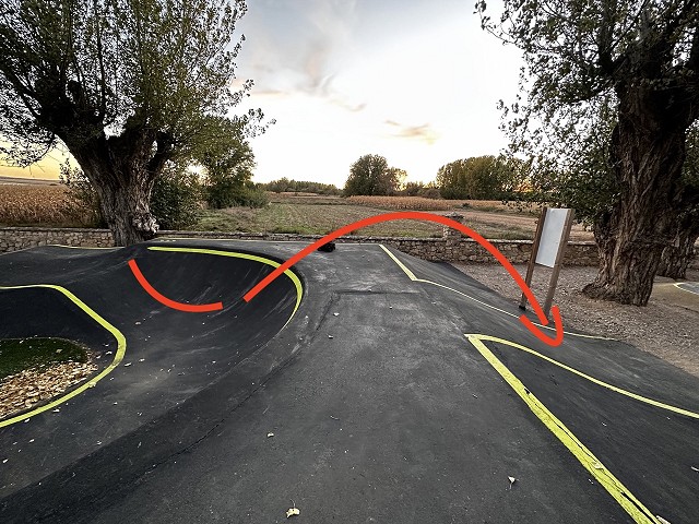 En algunos circuitos encontramos pequeños trucos,saltos o cambios de dirección que aun que no estén marcados, pueden ser muy divertidos. Siempre sin poner en riesgo la seguridad de los demás usuarios. En este el unico que vemos seria salir saltando del peralte justo al lado de la salida y saltar hacia la rampa de acceso.